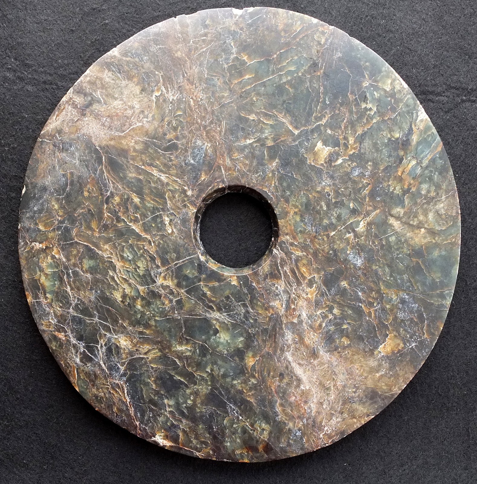 - Jade is rather fibrous in several places; rim is chipped with much calcification.